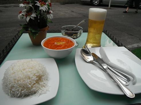 30分くらいは待っただろうか、やっと料理が運ばれてきてビールを追加オーダー、カレーはトマトっぽい味に絶妙のスパイスという感じで美味しく、チキンは皮も骨もなく食べやすい。ご飯は美味しくないし量が多いのでナンにすればよかった。悪くはないけどソイ13のインドレストランのほうが美味しいような気がする。半分食べたところでタバコを一服していると***から電話がかかってくる。