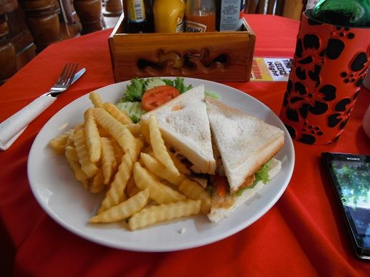 それから腹が減ったので適当な店に入ろうとビーチロードに出てホテル方向に歩いていたら、どうしてもハンバーガーかサンドイッチが食べたくなったので、ソイ13に戻ってインハウスの外にあるレストランに入店する。ハイネケンとチキンサンドをオーダー、ここのチキンサンドは毎回食べているような気がする。ビールを2本飲んで285B、いつものキスに比べると高いけど満足の食事だった。