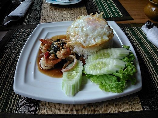 わかってはいたが、トドメを刺すような言い方で全力否定されてしまった。他にセンセーションズのドリンクノルマは月に150杯で今月は何杯足りないとか、センセーションズにキレイなレディは少しだけ、バカラはいっぱい、ホワッツアップはキレイでGood Bodyがいっぱいとか言っていた。コーヒーに酔っぱらったウドン嬢の話しに付き合っていると、最初にシーフードのガパオが来た。