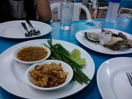 Bが「美味しいよ」と言って器に取り分けてくれたが、トムヤムクンのように辛酸っぱくて好みではない。それでも具だけを食べていたら、Bは具だけを追加するという悪循環。結局、どれも一品の量が多く、生牡蠣以外は半分くらい残してチェックビン。退店してセカンドロードに向かう・・・が、ソンテウ乗り場まで歩く元気がないのでバイタクでホテルに帰った。