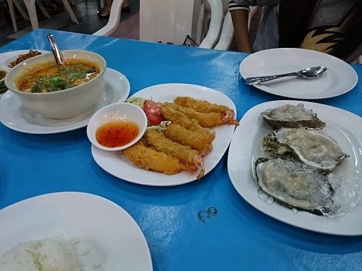 着席して飲み物はハイネケン、料理は生牡蠣、エビフライ、ご飯。ネコ耳は水と料理数品をオーダーした。最初に出てきたのは生牡蠣、続いてトムヤムクンとエビフライ。ネコ耳に生牡蠣を「食べる?」と聞くと「好きではない」と言うので1人で3個食べた。トムヤムクンは普通、エビフライは衣の中が半生っぽくて美味しくなかったが、ネコ耳がクレームを付けると揚げ直してきた。