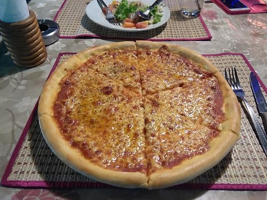 本格的な味・食感のピザで美味しいが12インチサイズ。2人で食べても2ピース残ってチェックビン。ピザマルガリータ、春雨のような麺のタイ料理、ハイネケン1本、水1本で500Bくらいだった。食後、歩いてホテルに帰ると、Aは恥ずかしがることもなく服を脱いで素っ裸。「シャワー」とバスルームに入ったので、バルコニーでタバコを吸っていると3分ほどで出てきた。