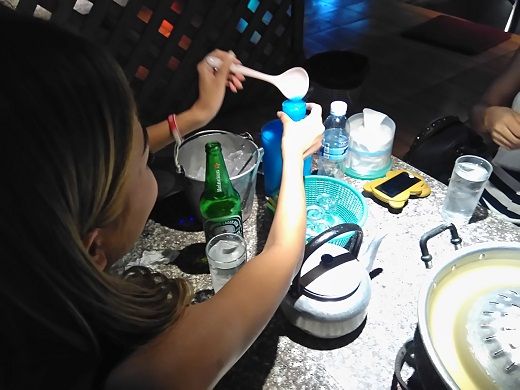 長居は無用だが、ドリンクノルマに協力しようと、Hのドリンクをオーダーしてチェックビン。退店してソイダイアナインでバイタクに分乗、サウスパタヤ通りのムーガタ「チャンの店」に移動する。席に着くとHが仕切るので、ハイネケン、ムーガタの豚バラ肉と鶏肉、コームーヤーン(焼豚)を所望。Hがまとめてオーダーすると、8月と同様にブルーハワイのスムージーもあった。