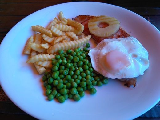 ジャーマンステーキはパイナップルと目玉焼きが乗ったポークステーキ。あまり美味しくないので、同じ199Bならビーフペッパーステーキにすればよかったと思いながら完食。食後、20分ほど携帯でインターネットを見たり、通りかかる人達をボーっと見たりして退店。ホテルに帰って荷物を整理していると、15時半頃バチェラーのBからLINEで「Pattaya」と入ってきた。