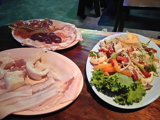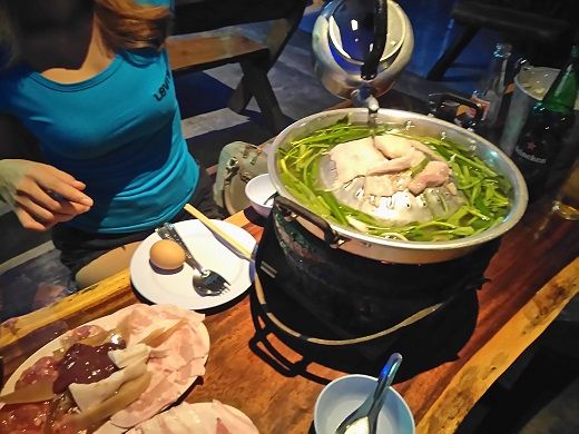 スルーしようと思ったが、本当に待っているようなので「10分」と送ってチェックビン。退店して再びバイタクでチャンの店に移動する。0時10分頃、予定より約1時間遅れで入店。オーダーはハイネケンだけを所望して、ムーガタ他はNに任せた。Nは「お腹が空いた」とパンツのボタンを外して大量に食べる構え。ムーガタの準備ができると煮たり焼いたりして取り分けてくれる。