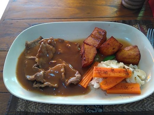 今までローストチキン、ダック、ポークを食べて美味しかったので、ビーフには期待していたが、139Bと高くて美味しくない。ソースは美味しいが、薄い牛肉を焼いただけ。しかも硬いので満足度の低い昼食だった。食後、遅れて食事に来た知人(J氏)と20分ほど話して退店。部屋に戻って小休止・・・。夜になって20時20分頃、身支度を整えて外出。ソイLKメトロに移動する。